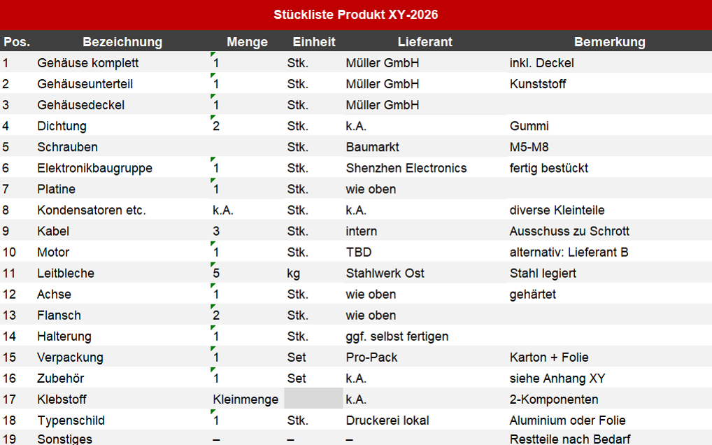 Wie geht es also besser? Für jedes zugekaufte Teil oder jeden Rohstoff sollte die Stückliste mindestens die folgenden Angaben enthalten: