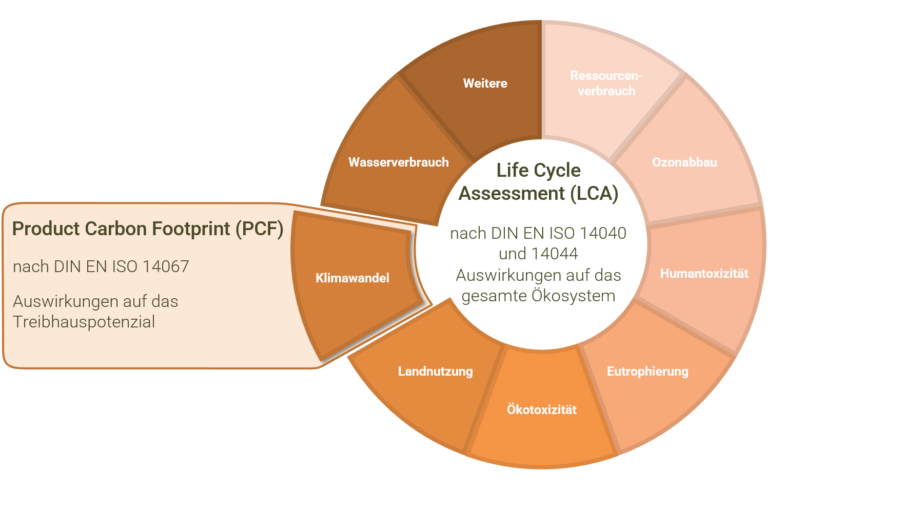 Ein Carbon Footprint wird in der Regel nach der ISO 14067 - Treibhausgase - Carbon Footprint von Produkten - Anforderungen an und Leitlinien für Quantifizierung berechnet und dokumentiert. Die Norm baut im Wesentlichen auf den beiden Standards für die Erstellung von Ökobilanzen auf, den ISO-Normen 14040 und 14044. Das heißt: Die grundlegenden Anforderungen an die Erstellung einer LCA und eines PCF sind gleich. Die ISO 14067 spezifiziert dann noch weitere Anforderungen an den Umfang und die Dokumentation der Berechnungen. Trotzdem kann ein Product Carbon Footprint als eine Art “erweiterter Ausschnitt” einer Ökobilanz betrachtet werden.
